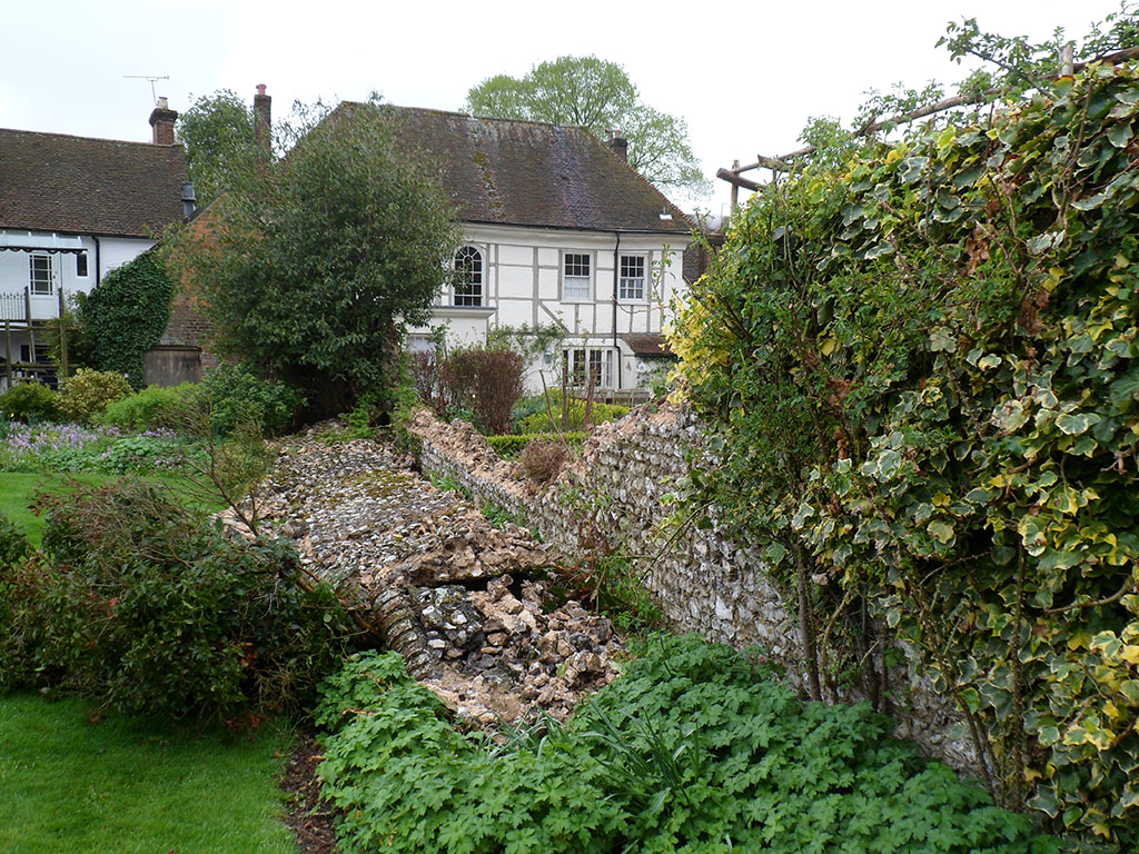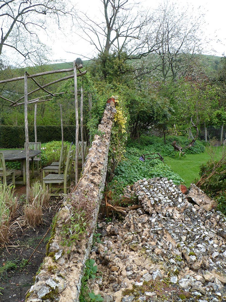 Collapsed flint boundary wall due to ivy penetration and wind damage