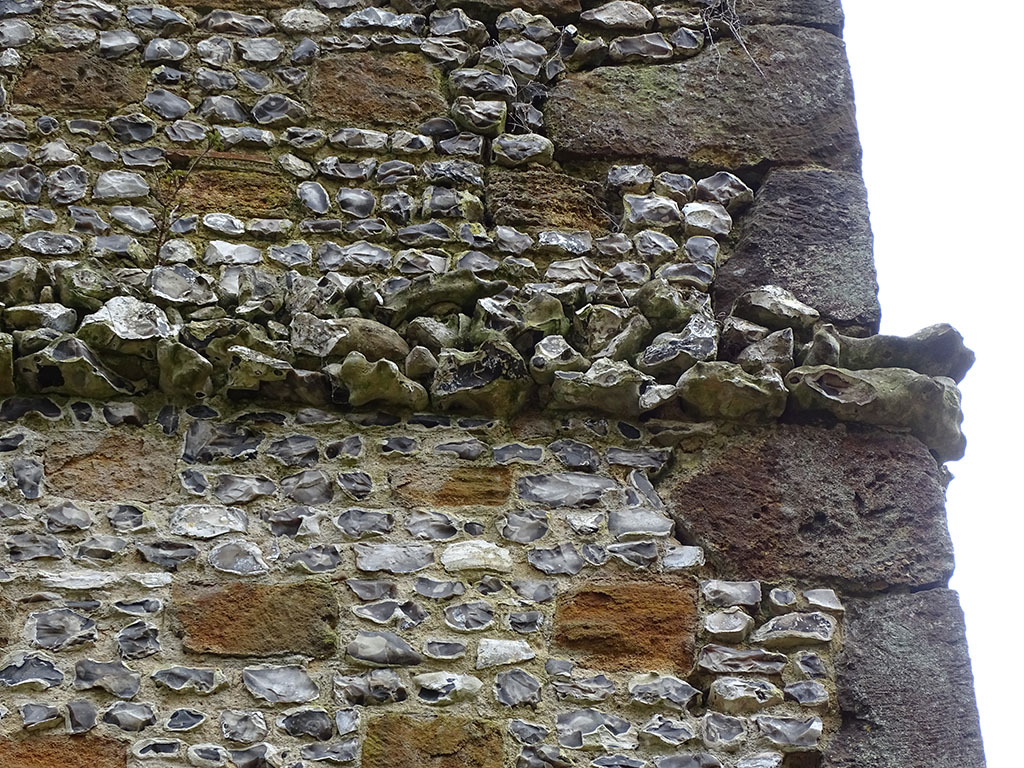 Consolidation of top of decayed tower and rebuild collapsed quoins and flint infill matching the existing