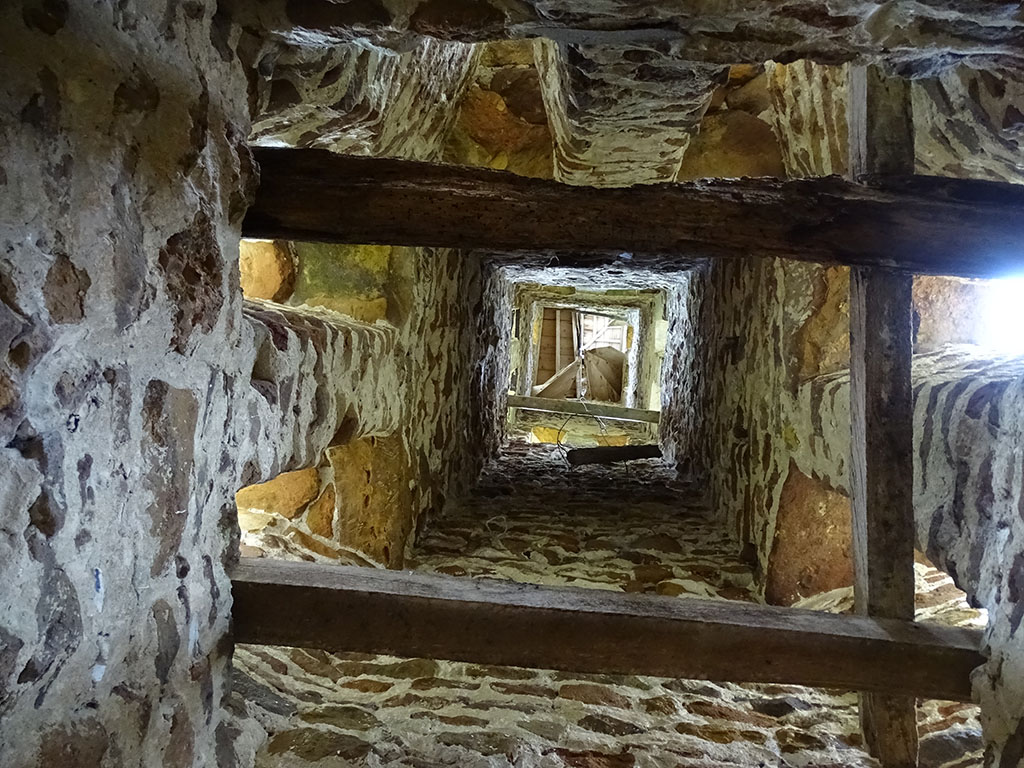 One tower left standing with collapsed hidden roof behind parapets